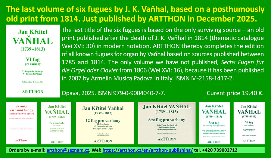 Another set of six fugues by J. K. Vaňhal (from the preserved 43 fugues published between 1785 and 1814 in Vienna) according to the edition from 1810 (Wei XVI: 23) is published in a new critical edition. Vaňhal dedicated this volume to Rudolf Jan (1788–1831), Archduke of Austria, disciple and patron of Ludwig van Beethoven, who was later Archbishop of Olomouc and Cardinal (1819–1831). ISMN 979-0-8004040-3-9. Curent price € 20,80,-. NEW